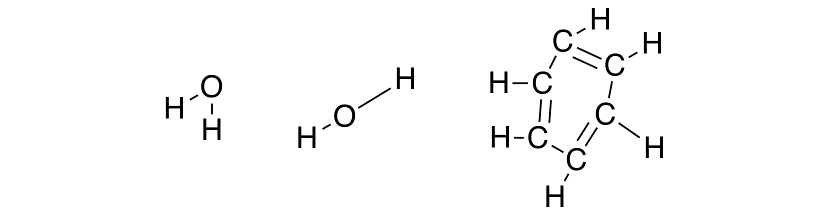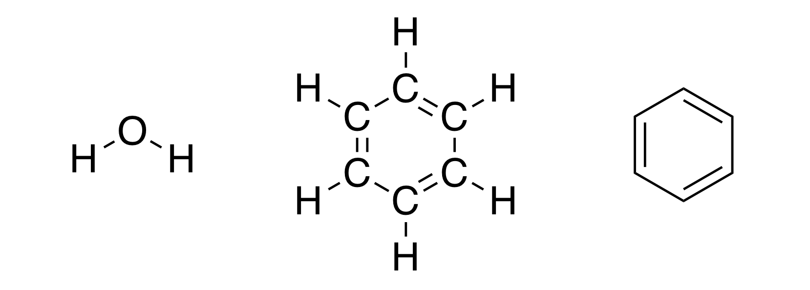 It's peculiar that we sometimes don't realize how much information (in the form of implicit assumptions) can be hidden in a single picture. It may seem that the image above simply shows the structural formulae of water and benzene. But if we think about it, by drawing those molecules in that way, we imply that both oxygen-hydrogen bonds in the water molecule have the same and certain length, that there must be a certain angle between the two O-H bonds. Otherwise, how else can we explain that we draw the structures above and not, for example, the structures below: