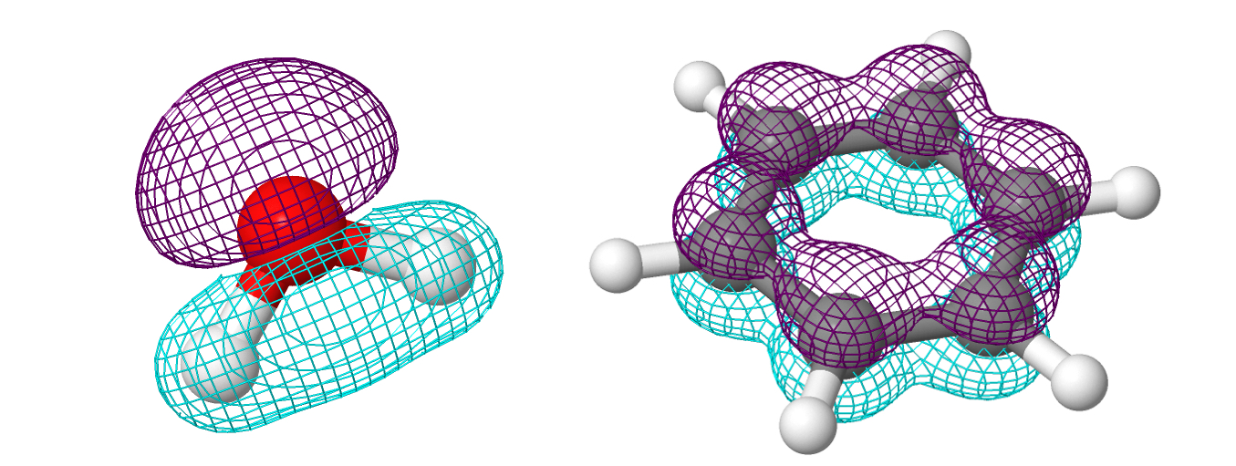The picture above shows, from left to right, top to bottom, the shapes of the orbitals of the hydrogen atom. By the way, that caveat about the "hydrogen atom" is not accidental at all. It may be surprising, but we know the exact shape of the atomic orbitals (AO) only for the hydrogen atom. We only assume that the shapes of the AOs of other elements are similar to the AOs of hydrogen. Back to our discussion, one might wonder, where are the electrons in molecules? It shouldn't be too shocking to hear that they reside in molecular orbitals (MOs). Molecular orbitals look like this:
